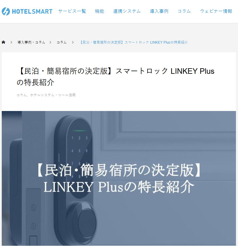 このたび、xxx(エイジィ)株式会社が運営する宿泊施設向けソリューションサイト「HOTEL SMART」にて、当社スマートロック LINKEY Plus の紹介記事が掲載されました。